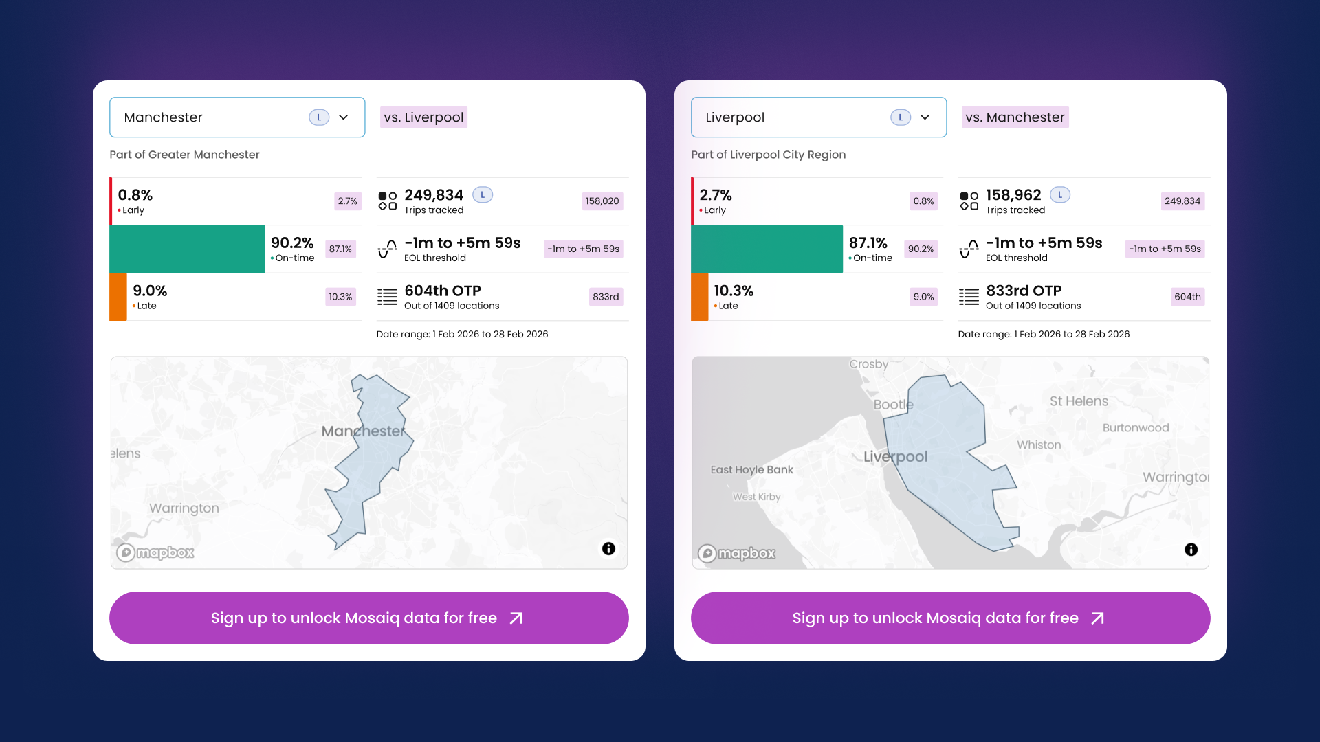To show how the GPTI works in practice, recent data from 1 to 28 February 2026 illustrates Manchester and Liverpool’s performance. Manchester achieved a first stop on-time performance of just over 90%, placing it 16th out of 175 UK locations, while Liverpool, which scored a slightly lower on-time performance score of just over 87%, ranked 47th. This example is intended only as an illustration: the Index is dynamic, allowing users to compare any location against local or global peers and see how performance changes over time.