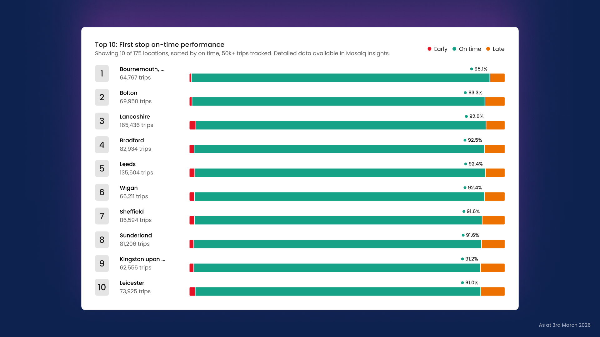 For broader context, the GPTI also highlights top-performing locations across the UK. The Spotlight on UK section of the Index lists the top 10 locations by first stop on-time performance. The top five include Bournemouth, Christchurch and Poole; Bolton; Lancashire; Bradford; and Leeds, demonstrating that high-performing networks vary widely in size and geography.